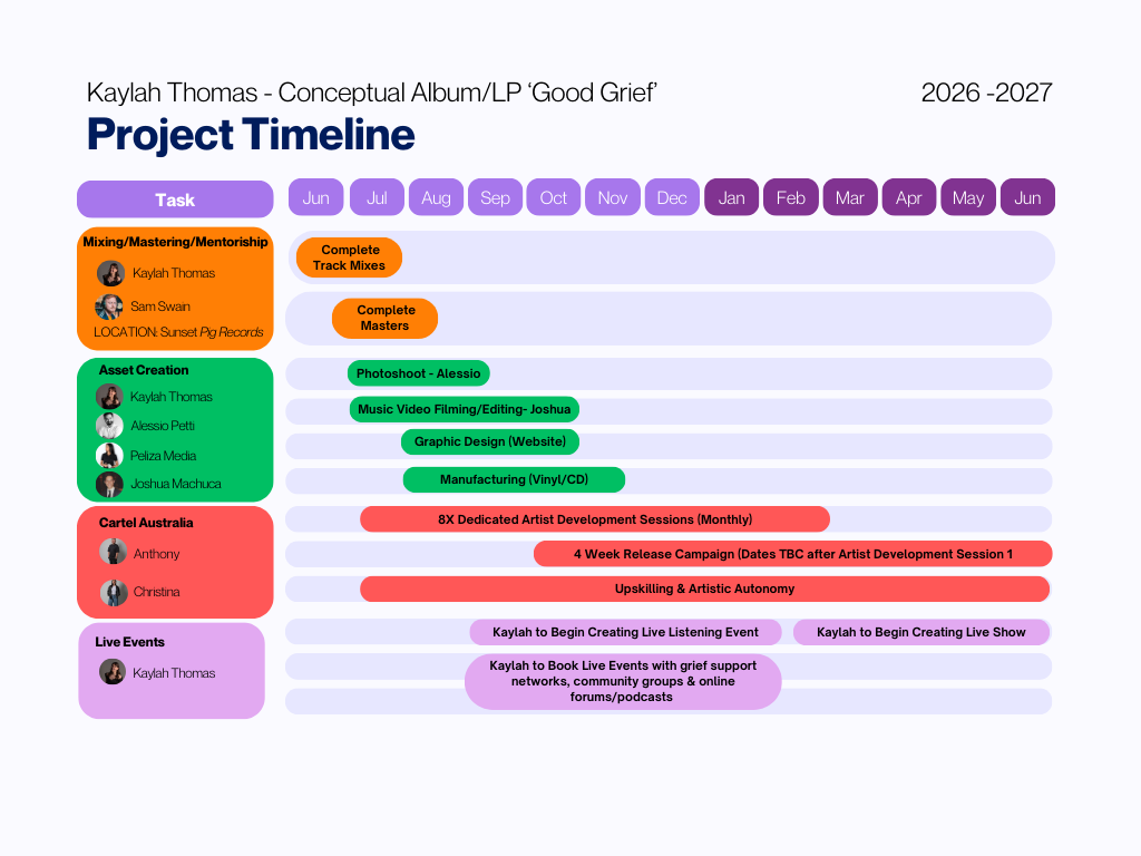 Please see attached a visual overview of the anticipated timeframes and key activity dates referenced in this application. Mixing/Mastering/Mentorship + Asset Creation + Cartel Australia (All activities seeking funding support)